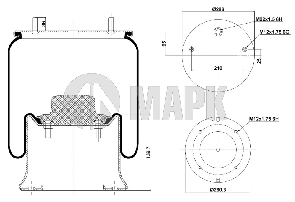 Пневморессора 6318/ 016512 без стакана Schmitz (2 отв.M8, 1отв.-шт.M12/22) (Sonder)